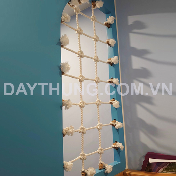 – Chất liệu 2: Lưới được đan từ dây thừng trắng công nghiệp. Lưới cũng rất chắc chắn vì đây là dây thừng an toàn, ngoài ra đặc trưng bởi màu trắng nên rất dễ phối màu trong thi công nội thất. Vì là dây công nghiệp nên sạch sẽ, không bị bụi lông như của sợi gai.
